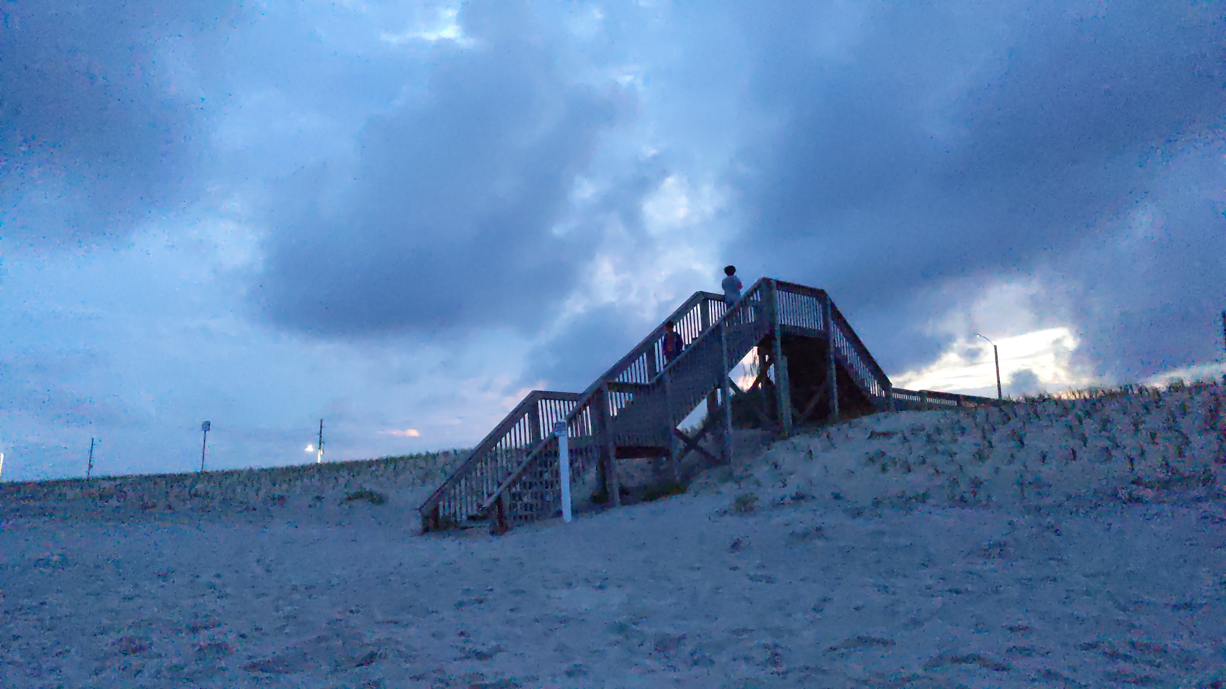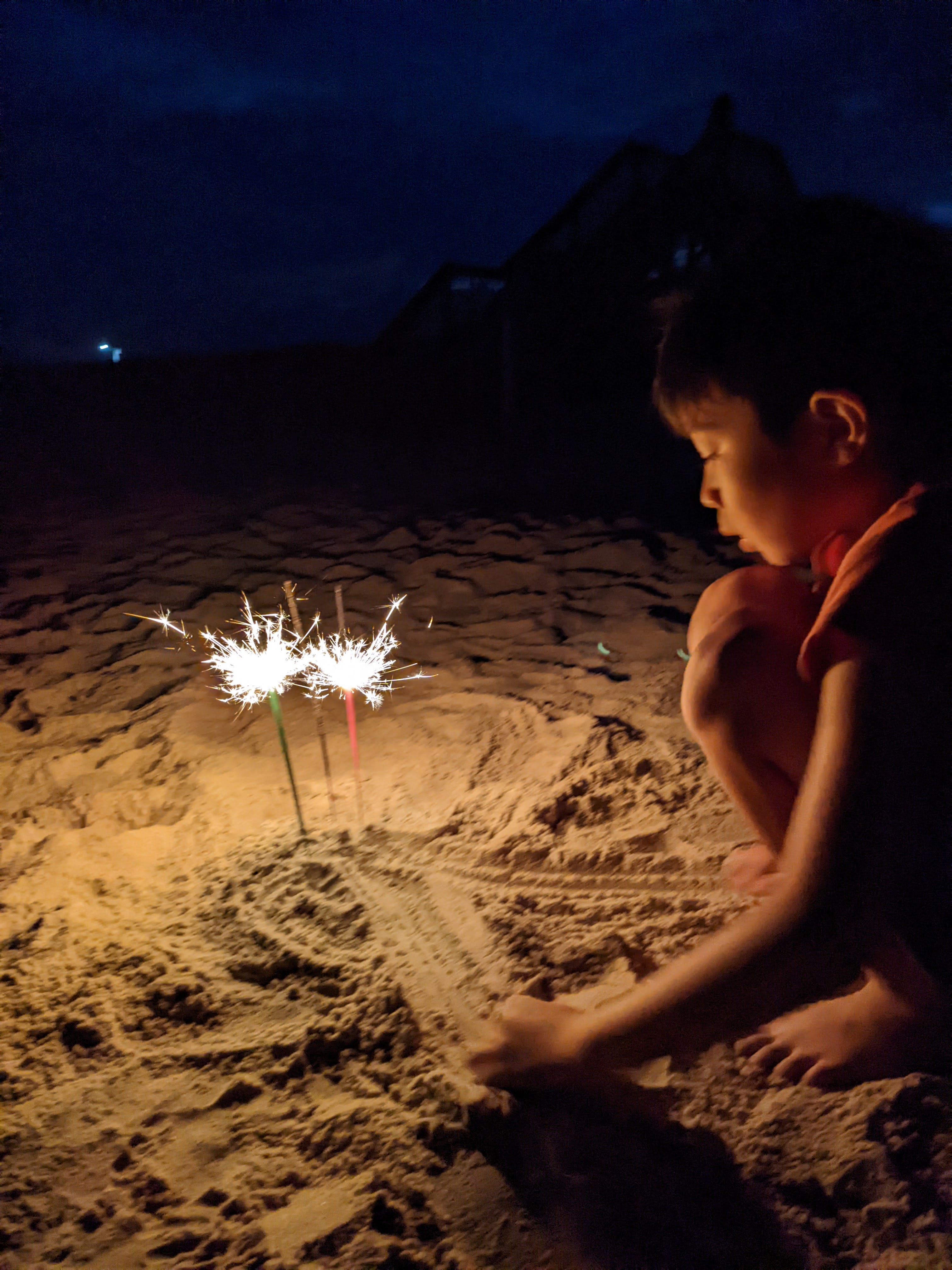 A younger version of our family just up the beach from us brought their own mini-fireworks and were attempting to light them as the wind fought the sparks. My eldest remembered to bring his camera this time and was taking photos of the sky, the beach stairs, the sand and other seemingly random items that caught his lens.
